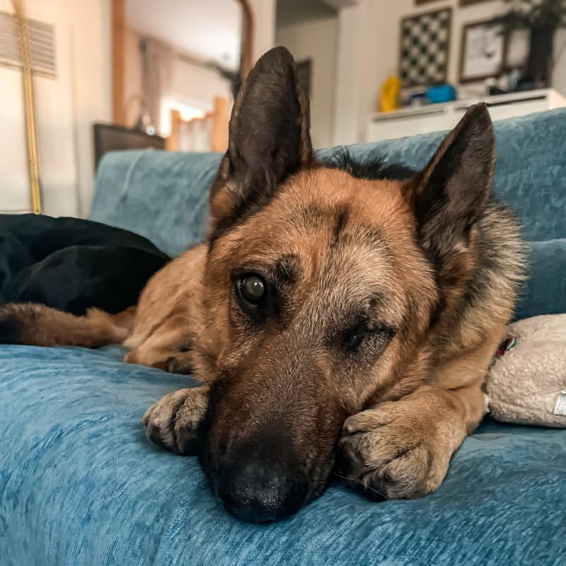 – Mellow couch potato/ gentle giant – Affectionate, sweet – Potty trained and crate trained – Great with other dogs – Loves to be by your side, but good left alone to snooze